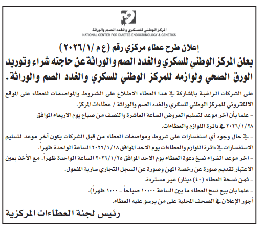 شراء وتوريد الورق الصحي ولوازمه للمركز الوطني للسكري