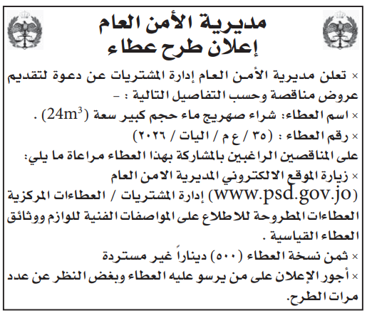 • إبحث في أكبر وأشمل قاعدة بيانات على مستوى الأردن, تحتوي على جميع العطاءات والمناقصات الحكومية، الدولية، الخاصة، والعسكرية مصنفة ومبوبة منذ عام 2013 حتى تاريخ اليوم!