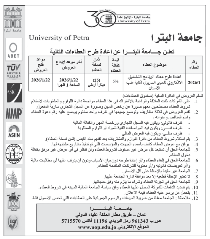 • إبحث في أكبر وأشمل قاعدة بيانات على مستوى الأردن, تحتوي على جميع العطاءات والمناقصات الحكومية، الدولية، الخاصة، والعسكرية مصنفة ومبوبة منذ عام 2013 حتى تاريخ اليوم!