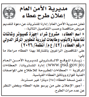 • إبحث في أكبر وأشمل قاعدة بيانات على مستوى الأردن, تحتوي على جميع العطاءات والمناقصات الحكومية، الدولية، الخاصة، والعسكرية مصنفة ومبوبة منذ عام 2013 حتى تاريخ اليوم!