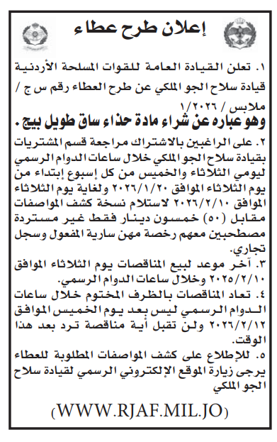 • إبحث في أكبر وأشمل قاعدة بيانات على مستوى الأردن, تحتوي على جميع العطاءات والمناقصات الحكومية، الدولية، الخاصة، والعسكرية مصنفة ومبوبة منذ عام 2013 حتى تاريخ اليوم!