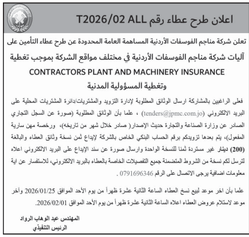 • إبحث في أكبر وأشمل قاعدة بيانات على مستوى الأردن, تحتوي على جميع العطاءات والمناقصات الحكومية، الدولية، الخاصة، والعسكرية مصنفة ومبوبة منذ عام 2013 حتى تاريخ اليوم!