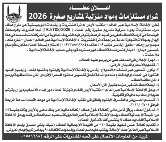 • إبحث في أكبر وأشمل قاعدة بيانات على مستوى الأردن, تحتوي على جميع العطاءات والمناقصات الحكومية، الدولية، الخاصة، والعسكرية مصنفة ومبوبة منذ عام 2013 حتى تاريخ اليوم!
