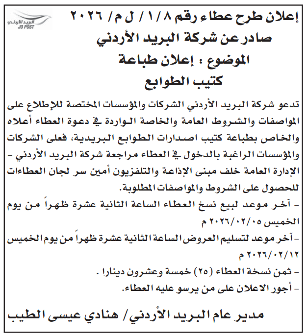 • إبحث في أكبر وأشمل قاعدة بيانات على مستوى الأردن, تحتوي على جميع العطاءات والمناقصات الحكومية، الدولية، الخاصة، والعسكرية مصنفة ومبوبة منذ عام 2013 حتى تاريخ اليوم!