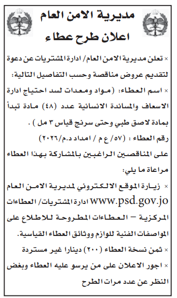 • إبحث في أكبر وأشمل قاعدة بيانات على مستوى الأردن, تحتوي على جميع العطاءات والمناقصات الحكومية، الدولية، الخاصة، والعسكرية مصنفة ومبوبة منذ عام 2013 حتى تاريخ اليوم!