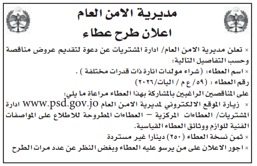 • إبحث في أكبر وأشمل قاعدة بيانات على مستوى الأردن, تحتوي على جميع العطاءات والمناقصات الحكومية، الدولية، الخاصة، والعسكرية مصنفة ومبوبة منذ عام 2013 حتى تاريخ اليوم!