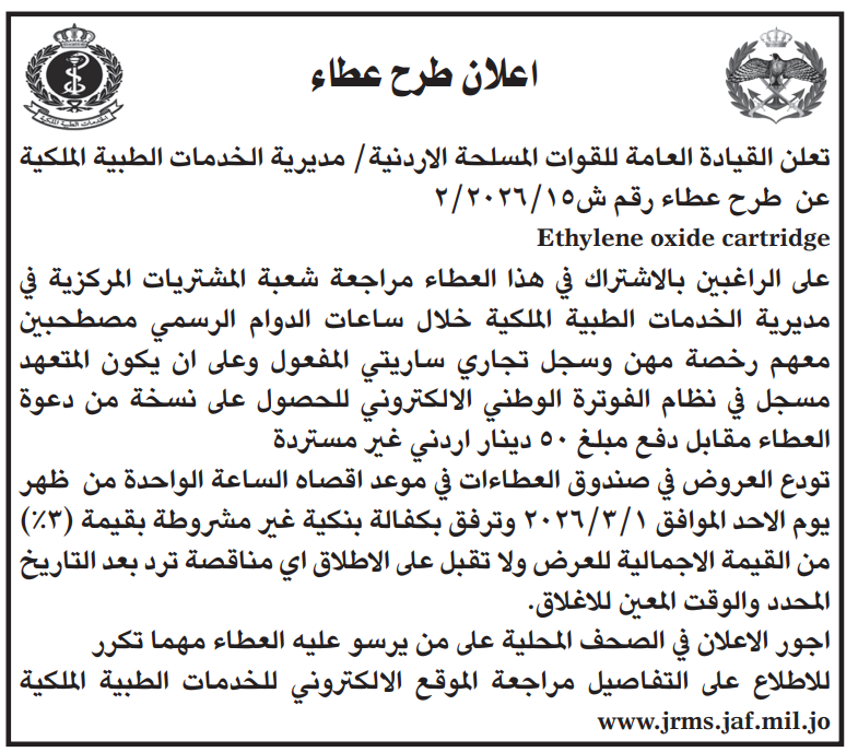 • إبحث في أكبر وأشمل قاعدة بيانات على مستوى الأردن, تحتوي على جميع العطاءات والمناقصات الحكومية، الدولية، الخاصة، والعسكرية مصنفة ومبوبة منذ عام 2013 حتى تاريخ اليوم!