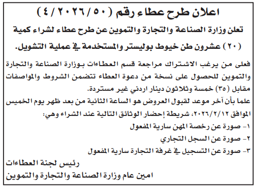 • إبحث في أكبر وأشمل قاعدة بيانات على مستوى الأردن, تحتوي على جميع العطاءات والمناقصات الحكومية، الدولية، الخاصة، والعسكرية مصنفة ومبوبة منذ عام 2013 حتى تاريخ اليوم!