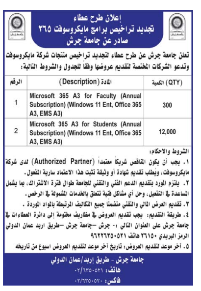 • إبحث في أكبر وأشمل قاعدة بيانات على مستوى الأردن, تحتوي على جميع العطاءات والمناقصات الحكومية، الدولية، الخاصة، والعسكرية مصنفة ومبوبة منذ عام 2013 حتى تاريخ اليوم!